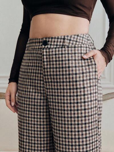 Plus Size Classic Plaid Straight-Leg Dress Pants, Draping Slimming Effect, Versatile For Commuting, Brown-27%
