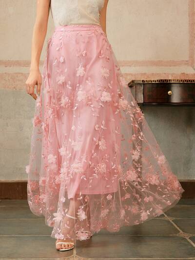 European & American Style Embroidered 3D Floral Mesh Long Skirt-42%