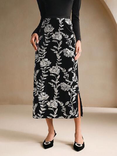 Vintage Floral Pattern Sequin Embroidered Velvet A-Line Skirt