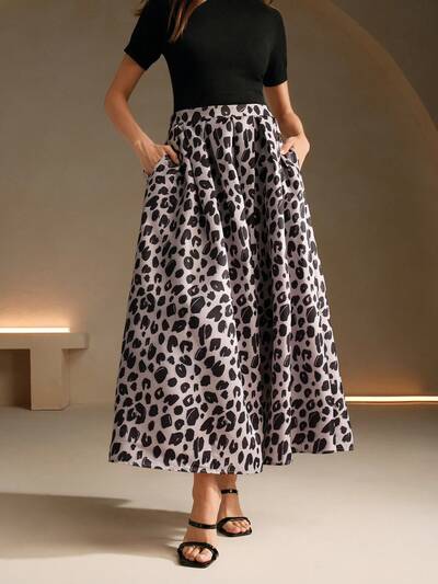 European And American Style Leopard Print Pleated A-Line High Waist Loose Skirt