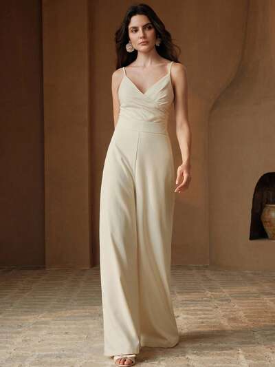 Women's Elegant Romantic Modern Spaghetti Strap Waist Cinched V-Neck Pleated Bust Design Backless Sheer Lace Jumpsuit Straight Leg Pants, New Year Clothes-27%