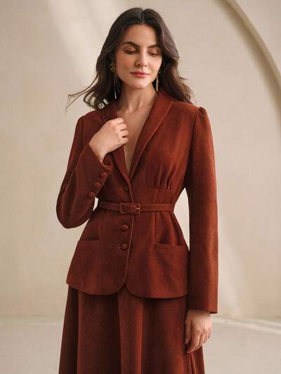 Women's Elegant Christmas V-Neck Long Sleeve Fitted Blazer & Flared Solid Color Skirt 2 Pieces Set, Vintage