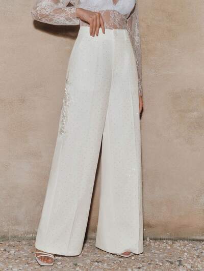 Elegant Party Vintage White Pants With Rhinestone Decoration, 3D Floral Craftsmanship, Slimming, Loose, Chic, Wide-Leg Design For Women-63%