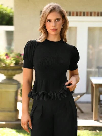 Women's Puff Sleeve Knitted Top With Petal Decorated Hem-35%