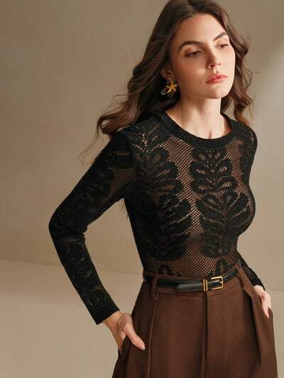 Anewsta Elegant Floral Jacquard Sheer Round Neck Women's Black Sweater, Chinese New Year Clothing, Women's Winter Knitted Pullover Sweater, Jacquard Blouse For Women-35%