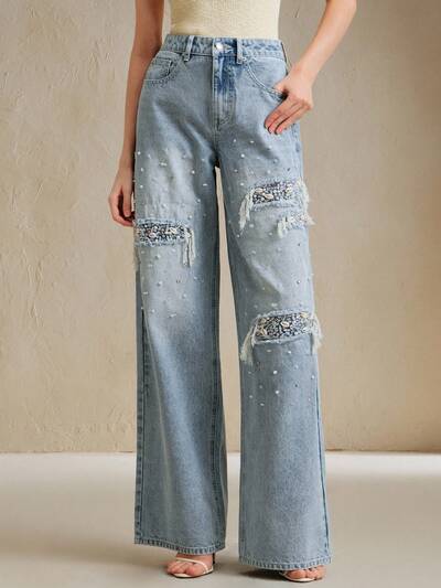 Distressed Faux Pearl Decorated Pockets Straight Leg Casual Jeans-25%