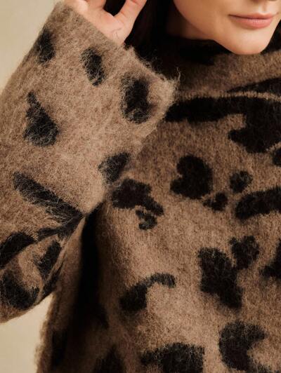 Women's Vintage Leopard Print Fuzzy Crew Neck Long Sleeve Rhinestone Embellished Sweater, Elegant Knit Top For Autumn, Winter, New Year Party, Black & Grey Color