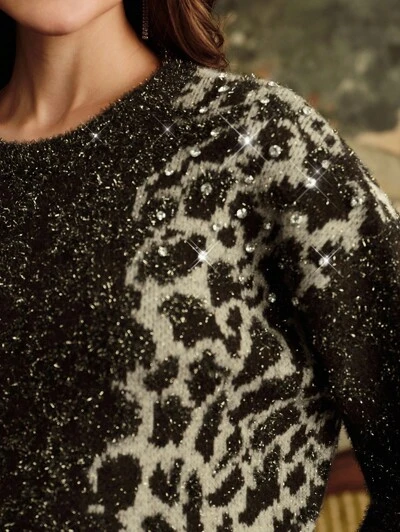 Women's Rhinestone Leopard Print Glitter Crew Neck Long Sleeve Knit Sweater-56%