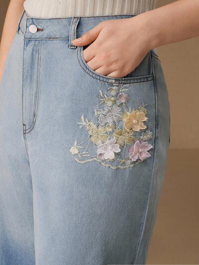Plus Size Women's Floral Embroidered Wide Leg Jeans, Elegant Urban Vacation Style, Suitable For Valentine's Day And Chinese New Year