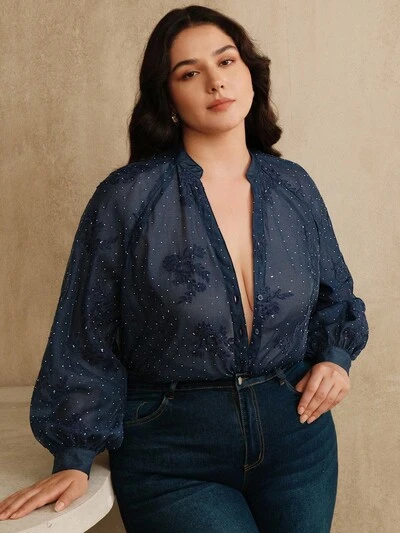 Elegant Fashion Elegant V-Neck 3D Floral Decor Loose Sheer Long Sleeve Plus Size Women Blouse Top, New Year Clothes-56%