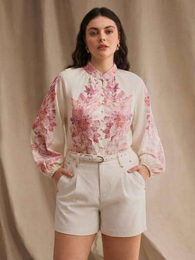Anewsta New Summer Vacation Casual Romantic Pink Floral Placement Print Stand Collar Raglan Sleeve Elegant Plus Size Women Blouse-34%