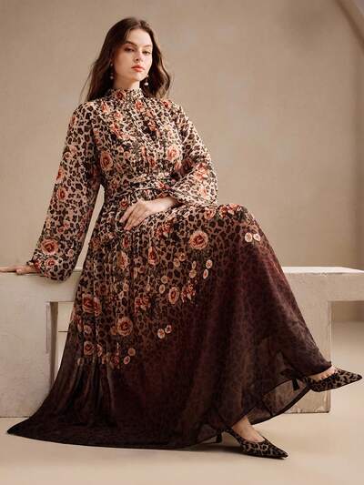 Plus Size Women's High-End Leopard Print Gradient Dye Vintage Stand Collar Long Dress, Autumn/Winter-28%