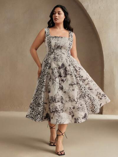 Plus Size Women Summer Holiday Casual Festival Vacation Beach Style Vintage Ink Leopard Patchwork Cinched Waist Sleeveless Square Neck Dress-27%