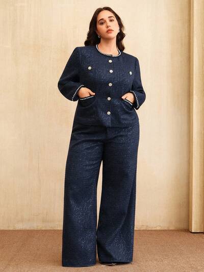 Plus Size Women's Autumn/Winter New French Classic Retro Modern Round Neck Tweed Jacket With Sequins, Tassel, Pearl Ribbon, Exquisite Metal Decor, Waist Cinched, Elegant
