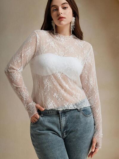 Plus Size Sexy See-Through Lace Long Sleeve Blouse For Holiday Party Clothes-28%