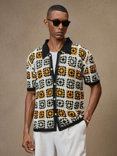 Men's Floral Print Hollow Short Sleeve Casual Polo Neck Knit Top