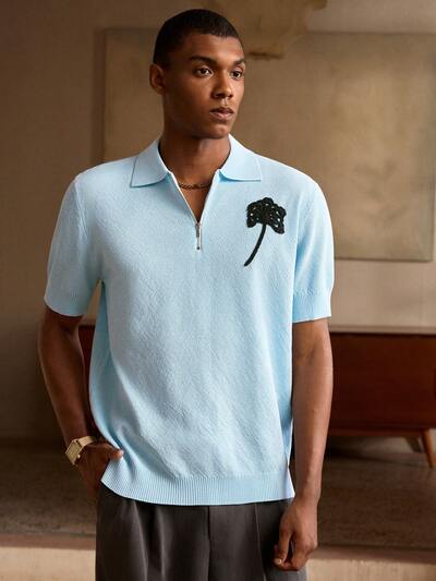 Blue Knit Collared Romantic Rose Embroidery Casual Short Sleeve Sweater For Men