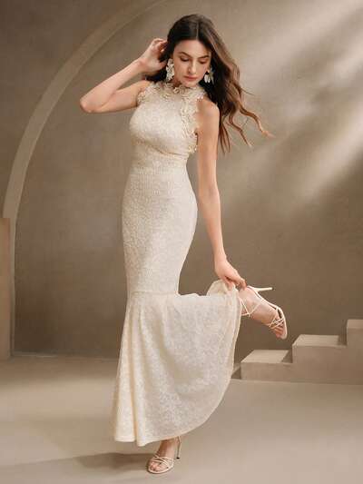 Elegant High-End Cinched Waist Heavily Embellished Shiny Random Sequin Design Women's Long Dress