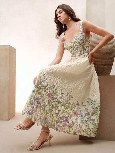 Elegant Jacquard Floral Print Maxi Dress, Suitable For New Year's, Valentine's Day, Vacation, Summer Date Night, Spring/Summer Outfits For Women-40%