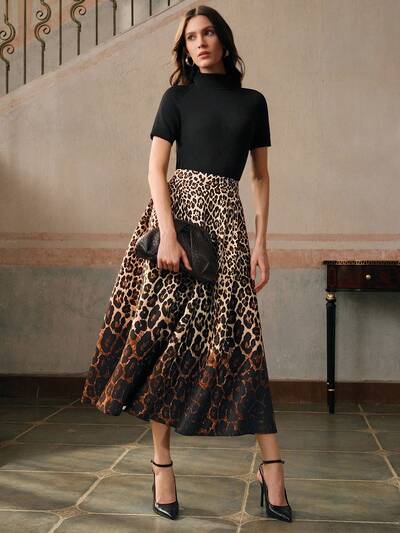 Retro Ombre Leopard Print High Waisted A-Line Midi Skirt For Women, Vacation Style