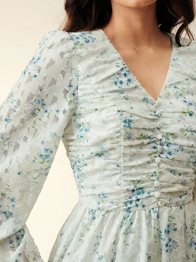 Spring/Summer New Light Blue Fresh Shell & Floral Print Collar Ruffle Long Sleeve Women Shirt