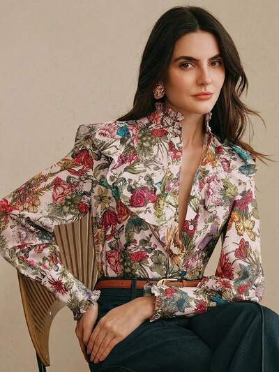 Spring/Summer New Arrival Elegant Floral & Butterfly Print Stand Collar Ruffle Trim Long Sleeve Women Blouse