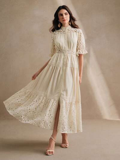 New Luxury Hollow Lace Panel Splice Waist Fitted Dress-23%