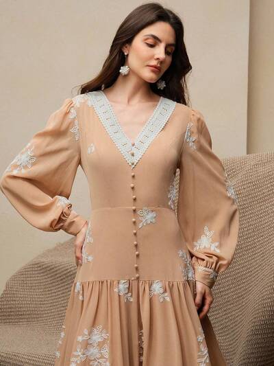 Women's Long Summer Dress With Floral Lace Design, Kaftan Style, Elegant, Waist Cinched, Flared Skirt, Suitable For New Year, Christmas, Valentine's Day