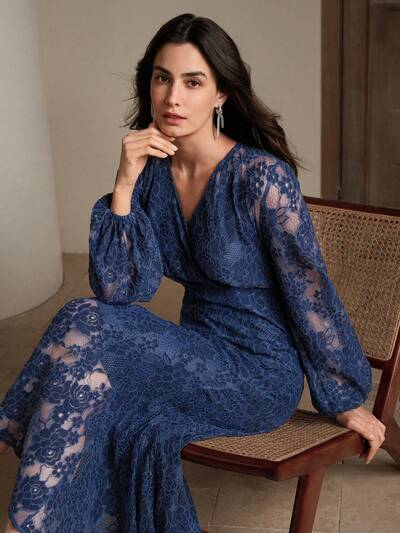 Elegant V-Neck Sequin Embroidered Tie-Waist Dress, Romantic Long Dress For Women, Suitable For Fall, Winter, New Year, Party, Wedding-60%