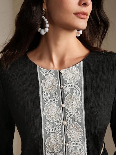 Women's Elegant Collared Long Sleeve Black Blouse, Embroidered Detailing Women's Long Sleeve Embroidered Blouse-60%