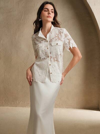 Women's Elegant French Style Sheer Lace Round Neck Blouse For Summer
