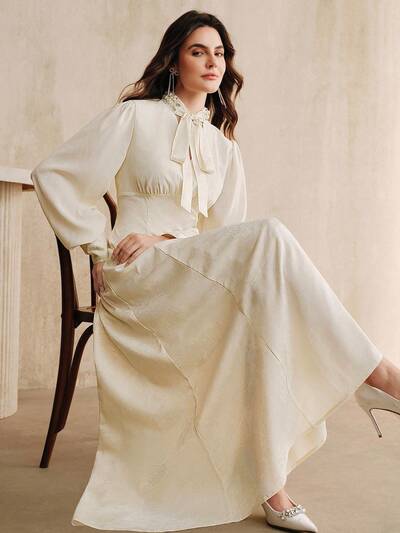 Women's Long Sleeve Flared Bow Elegant Dress, Graceful Holiday Dress
