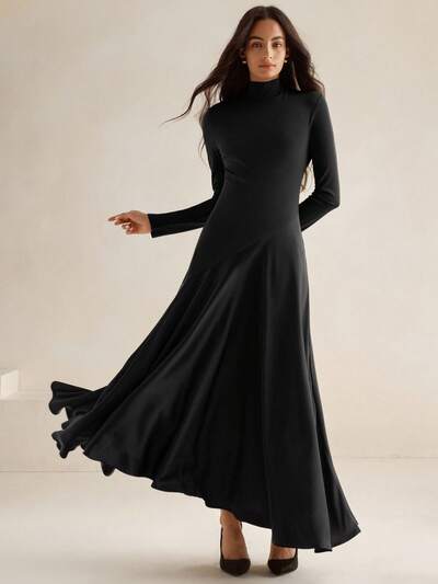 Anewsta Essential City Elegant Knit Patchwork High Neck Long Sleeve Spaghetti Strap A-Line Dress-25%