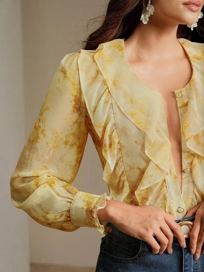 Women's Elegant Floral Ruffle Trim Refined Sweet Girl Downaing Versatile Blouse
