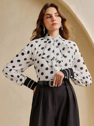 Romantic Polka Dot Stand Collar Long Sleeve Blouse With Tie For Women, New Autumn
