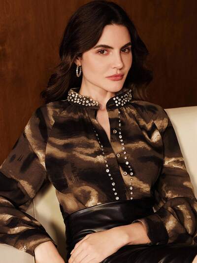 Elegant Women's Brown Collar Woven Fabric Shirt With Embroidered Long Puff Sleeves And Regular Length