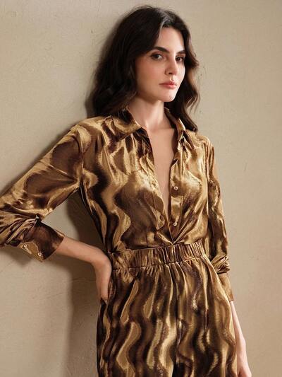 Women's 2-Piece Set, Autumn/Winter New Season, Halloween & Christmas, Vintage Urban Chic Shiny Wavy Pleated Textured Fabric Loose Comfortable Fashionable Top And Casual Pants
