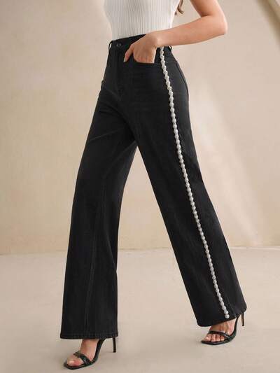 Patchwork Beaded Blue Denim Jeans For Women, Suitable For Street Style, Autumn, Fall, Winter, Going Out, Elegant, Formal, Party, Chic, New Year, Christmas, Work, Graduation, Wedding