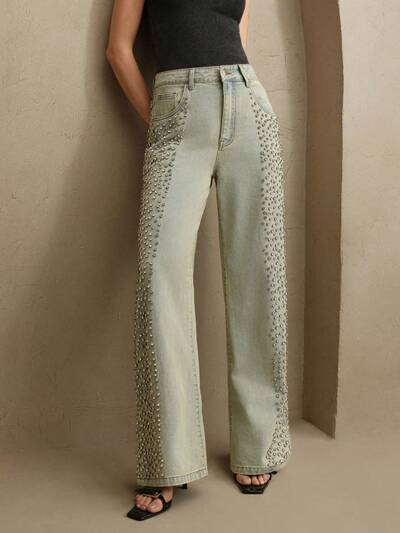 Elegant Women Rhinestone Decor Straight Leg Jeans, Suitable For Festival And Casual Wear