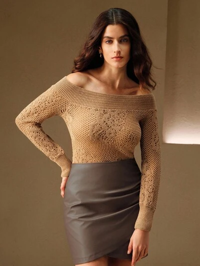 Autumn/Winter Off Shoulder Khaki Chenille Hollow-Out Jacquard Knit Top-52%