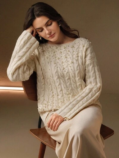 Women's Autumn High-End White Beaded Sweater, Loose Mid-Length Knitted Cable Knit Pullover Top, Suitable For Winter
