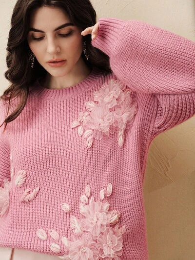 New Thick Pullover Sweater, Floral 3D Embroidery Knitted Sweater, Loose Fit Long Sleeve Sweater, Casual Slouchy Knit Top, Autumn/Fall/Winter, Suitable For Going Out, Elegant, Formal, Chic, New Year, Christmas, Graduation