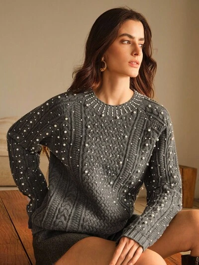 Women's Autumn/Winter Pearl Design Gray Sweater, Loose Knit Pullover, Elegant Winter