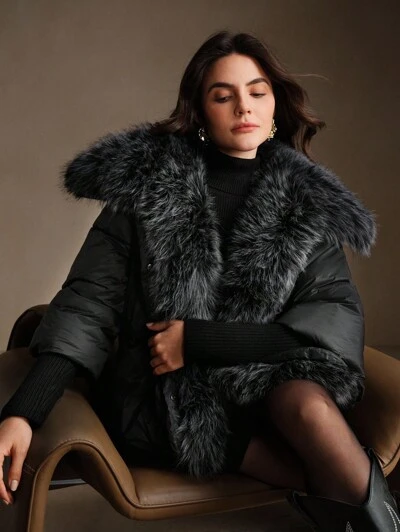 Premium Luxury Thick Coat With Knit Cuffs And Oversized Faux Fur Collar, Suitable For Autumn, Fall, Winter, Going Out, Elegant, Formal, Party, Chic, New Year, Women's Winter Coat, Christmas, Work, Graduation, Wedding-25%