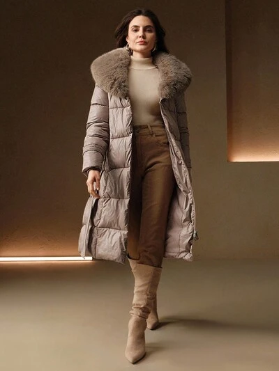 Women's Mid-Length Zip-Up Padded Coat With Fashionable Waist Cinching And Large Fur Collar, Winter-60%