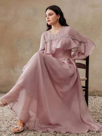 New Plus Size Women's Spring/Summer Long Pleated Waist Shiny Elegant Multifunctional Dress, Shoulder & Sleeve Floral Rivet Pearl Rhinestone Embellished, High-End Glamorous Party Dress