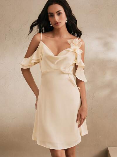 Spring/Summer New Floral 3D Print Silk Satin Ruffled Sleeve Short Dress, Elegant For Vacation, Date Night, Beach-42%