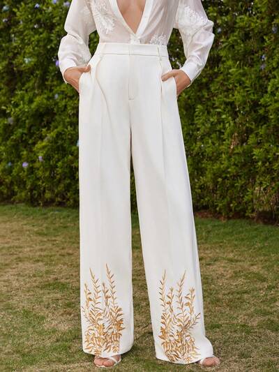 High-Waisted Straight-Leg White Women's Suit Pants With Floral Embroidery, New Year's, Festival, Spring, Vacation-39%