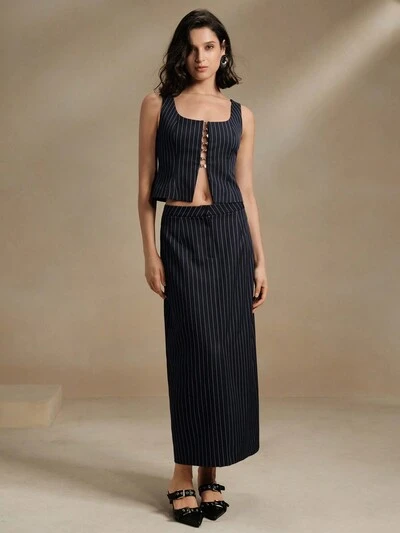 Women's Vertical Stripe Suit Jacket And Pencil Skirt Set-21%