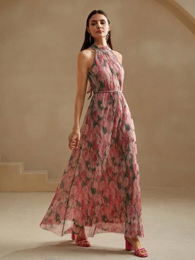 Spring/Summer Pleated Blue Floral Print Maxi Dress, Elegant Dress For Valentine's Day-26%
